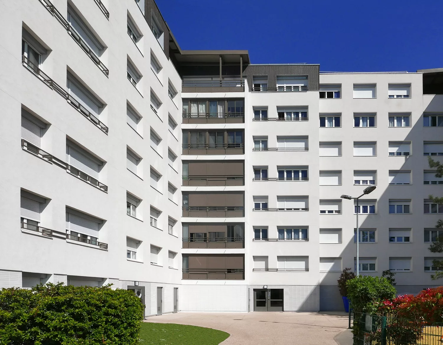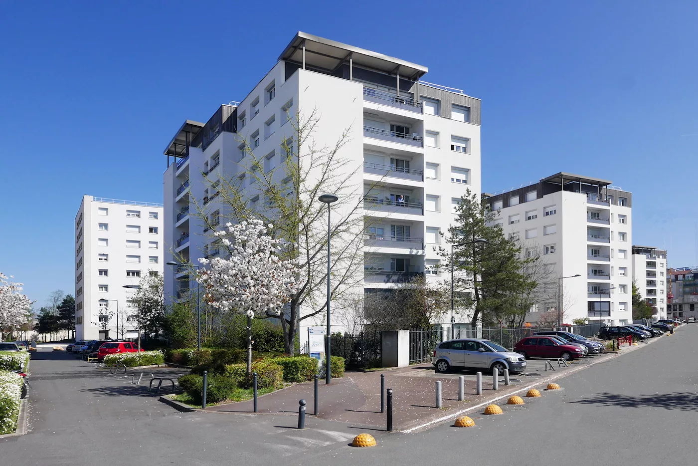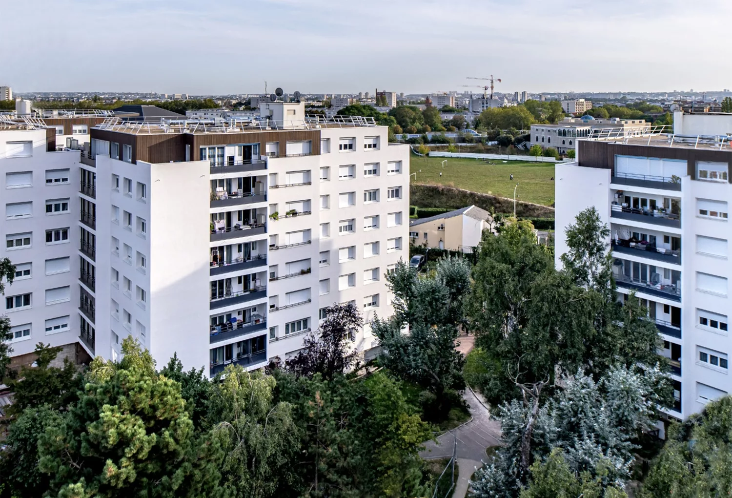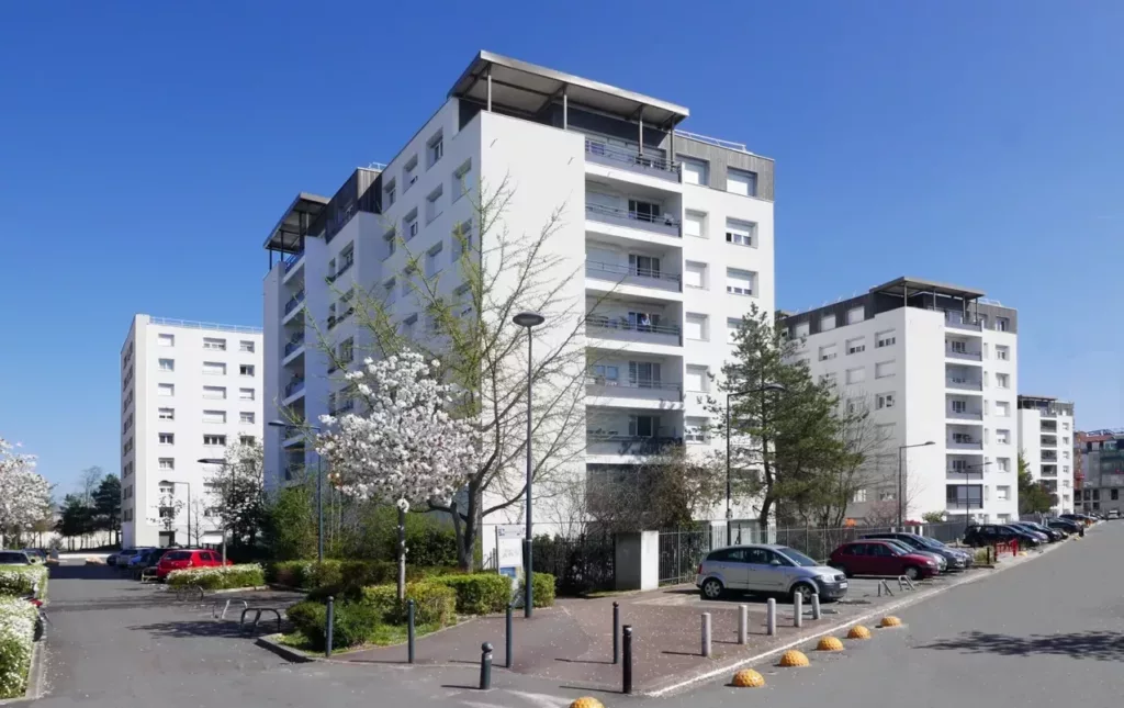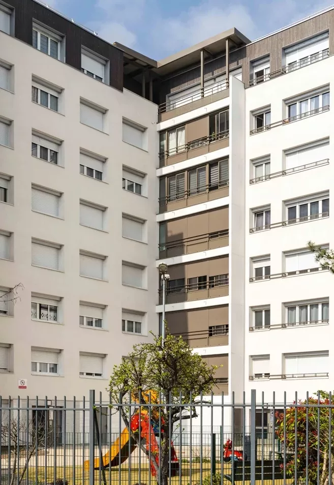 Le projet concerne la réhabilitation thermique de 367 logements occupés au Blanc-Mesnil (93), dans le cadre du NPNRU. Il comprend la fermeture des loggias, une ITE avec enduit mince et bardage, l’étanchéité des toitures terrasses et terrasses privées, le changement des menuiseries, ainsi que la rénovation des auvents et balcons. Les parties communes sont mises aux normes : halls, cages d’escalier, sécurité électrique, interphonie, gaines techniques et désenfumage. Les logements bénéficient d’une rénovation complète des pièces humides, de la VMC et de l’électricité. Certification visée : Label HPE Rénovation ou BBC Effinergie.