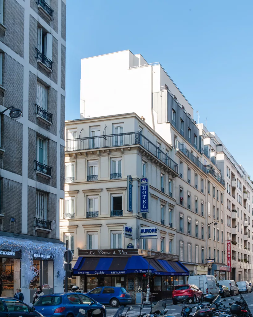 Ce projet combine la surélévation de deux niveaux en ossature bois et la restructuration de bureaux existants. L’opération vise à offrir de nouveaux logements performants et confortables, tout en améliorant les parties communes et en maintenant l’activité des commerces en rez-de-chaussée. Une attention particulière a été portée à la performance énergétique, au confort acoustique et à l’intégration architecturale de la surélévation au bâti existant grâce à l’utilisation de matériaux nobles tels que le bois et le zinc.