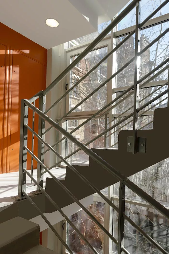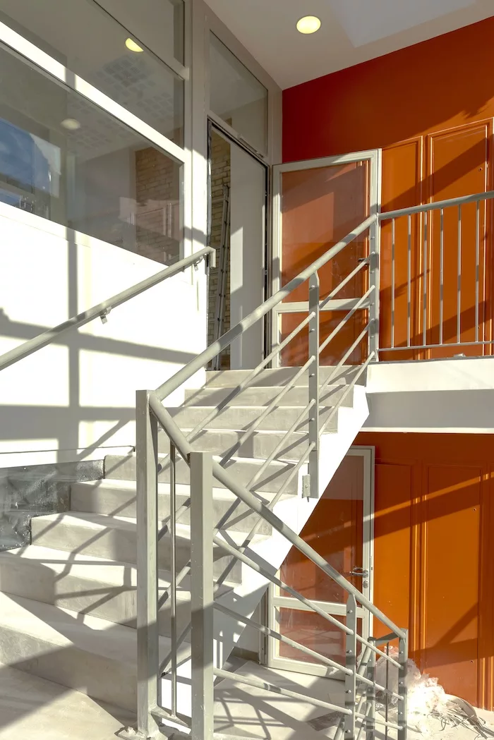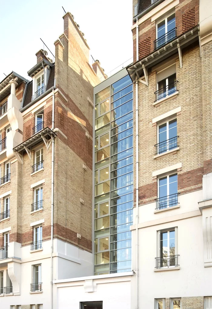 Construction d’une cage d’escalier avec ascenseur entre pignons de bâtiments existants et restructuration de logements